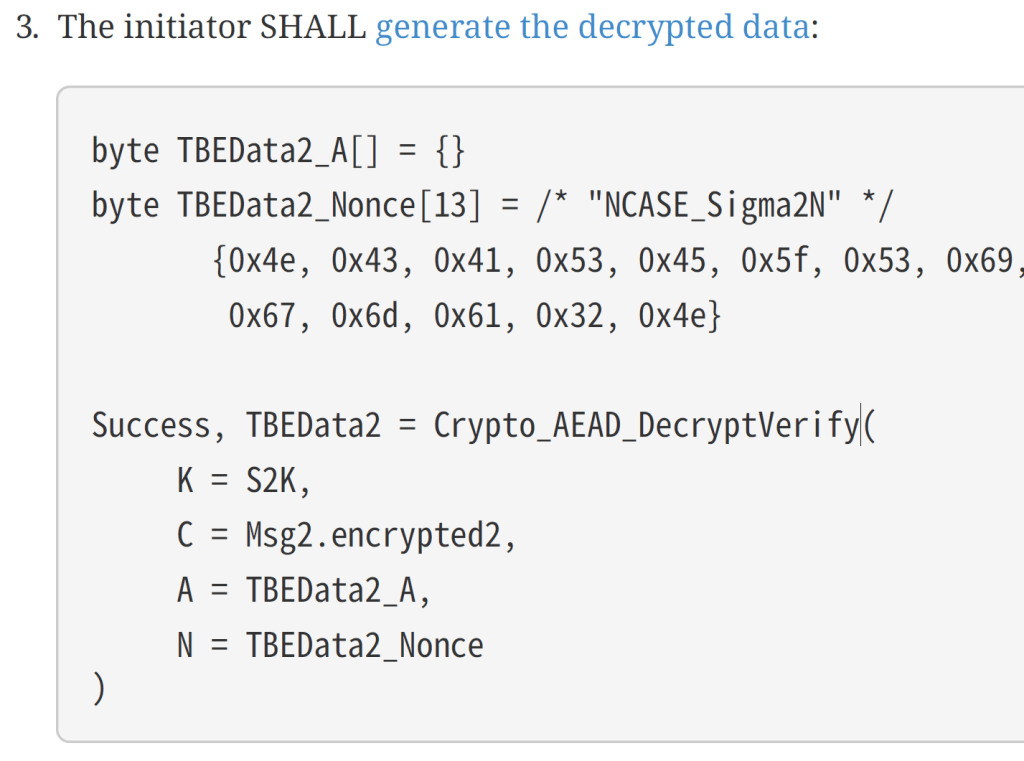 I then encrypt that in a similar fashion as I did with to decrypt the Sigma2 payload. After some tweaking, everything matched up on the matter.js side, but I got this error: