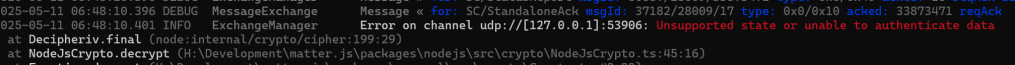 In this case, it appeared that it was trying to decrypt my StandaloneAck using the new CASE session. That message was being sent in the old PASE session. After some looking, I spotted my mistake! I was omitting the ExchangeId in my AcknowledgeMessageAsync method. This must have confused matter.js and made it use the *current* session by default. I fixed that and…the retranmissions all but vanished!
