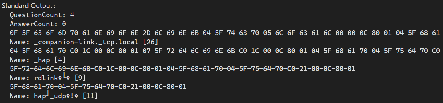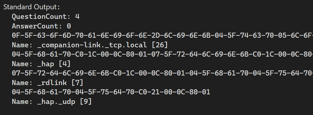 During my initial development all those years ago, I remember being surprised that the various DNS names aren’t just strings e.g. _hap._tcp.local. They actually have a special encoding.