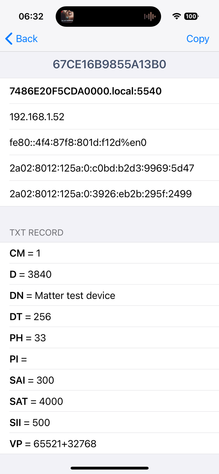 This basically says advertise the service _matter._tcp.local on a host called TOMAS. It’s available on PORT 11000 on these IP addresses