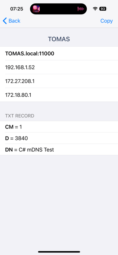You can see some IPv4 addresses, the port 11000 and a TXT record values I included.
