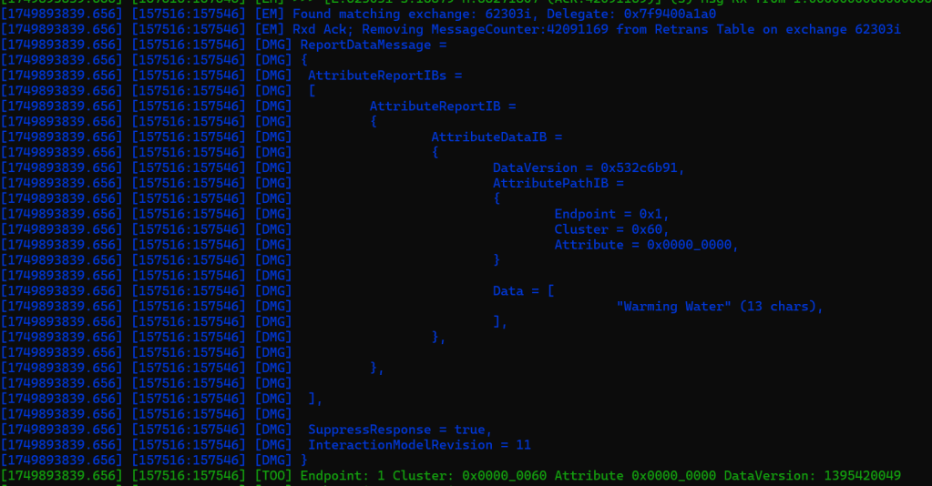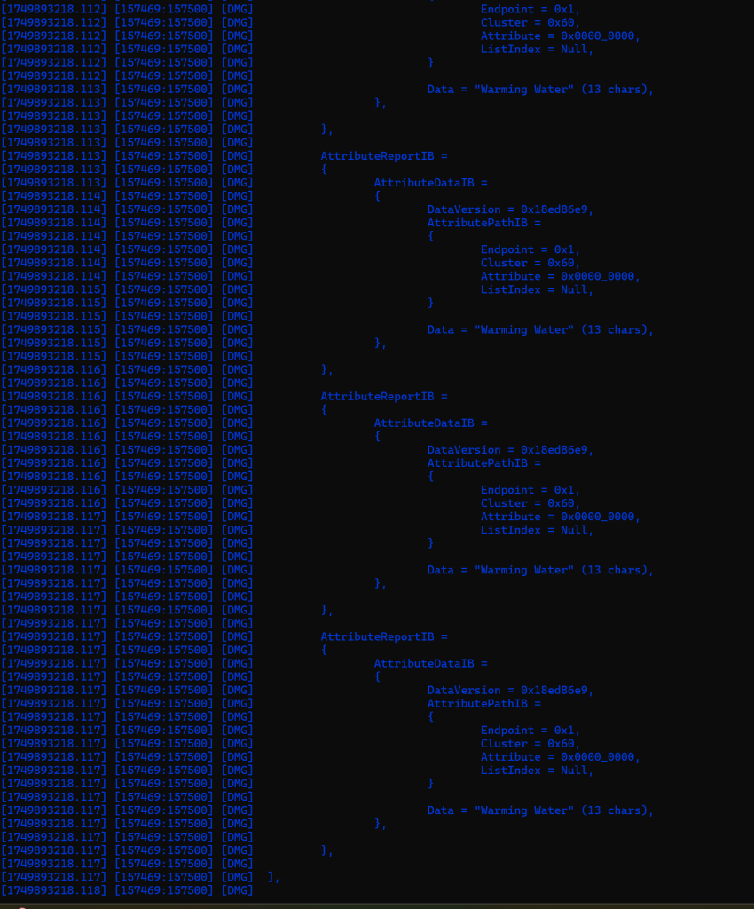 I wondered if this wasn’t some sort of callback where you have to say when you’re done. I looked through more code and this confirmed my suspicion. I needed to say “CHIP_ERROR_NOT_FOUND” when I was finished. I updated my method to return a single “Warming Water”.
