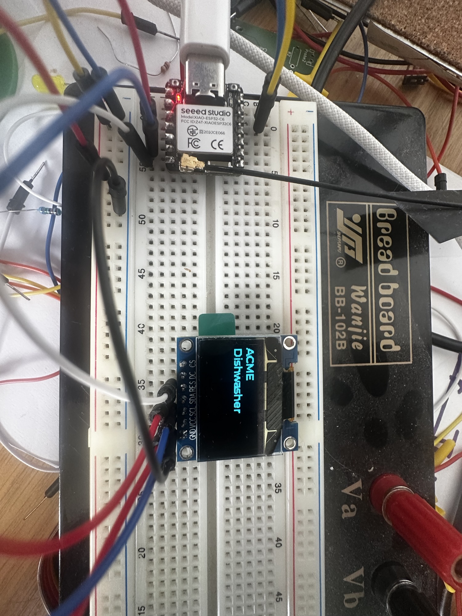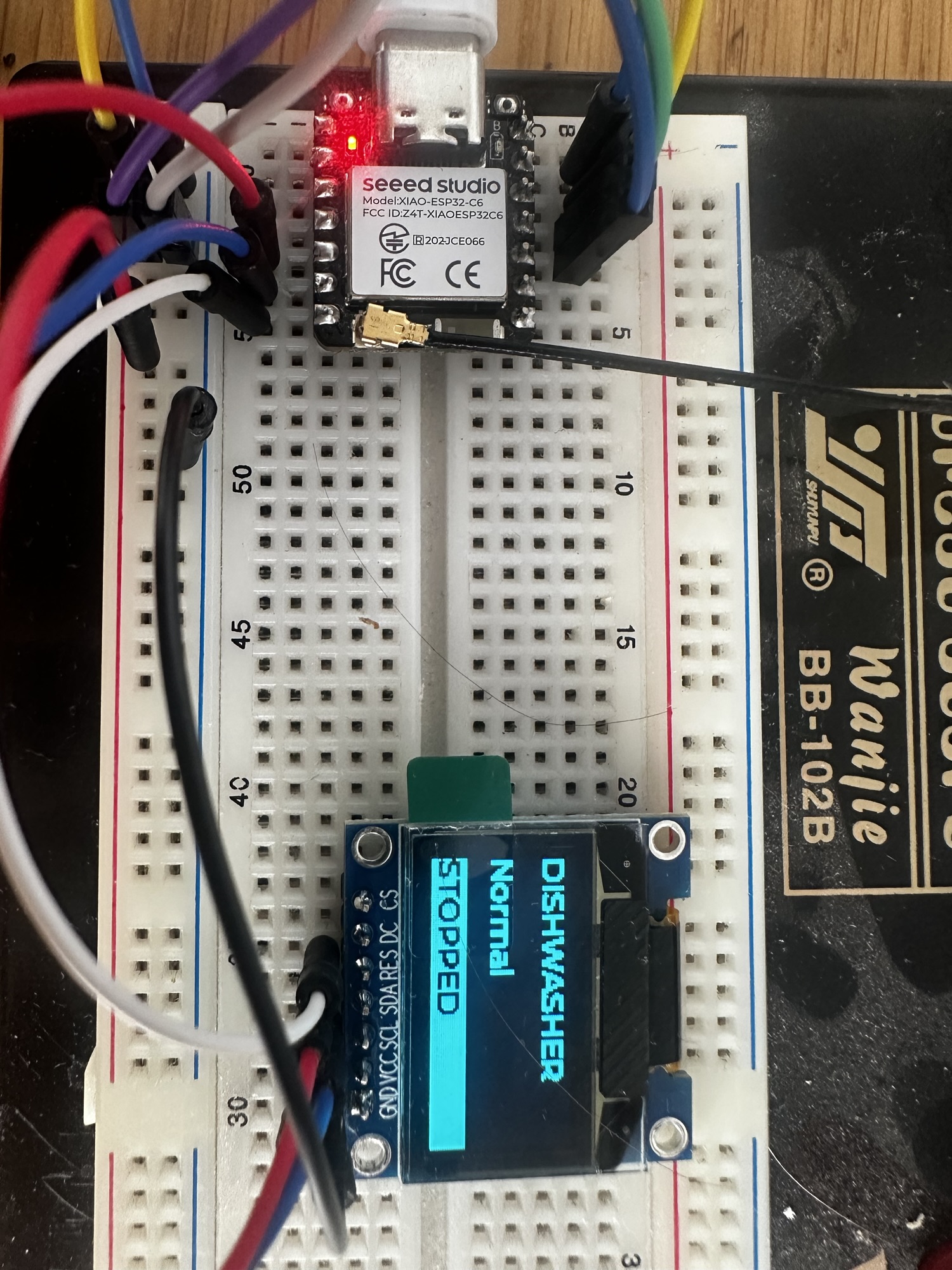 I implemented a Matter Dishwasher emulator with hardware controls and an OLED display. It has an on/off button, allows the Program to be selected before its started and can be started and stopped. It also shows a simple countdown to mimic a real operation.