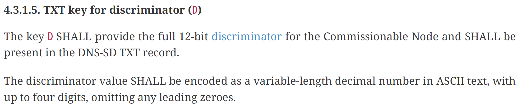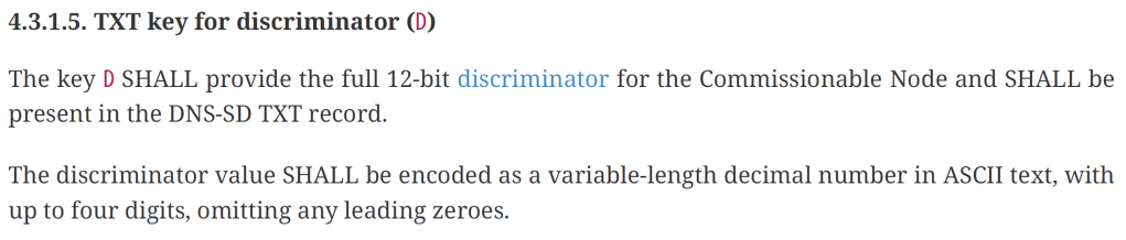 This worked well, but I didn’t have enough to identify the device I wanted. I needed to get the discriminator value too. This value is included as a TXT record in the mDNS announcement.
