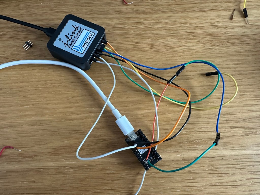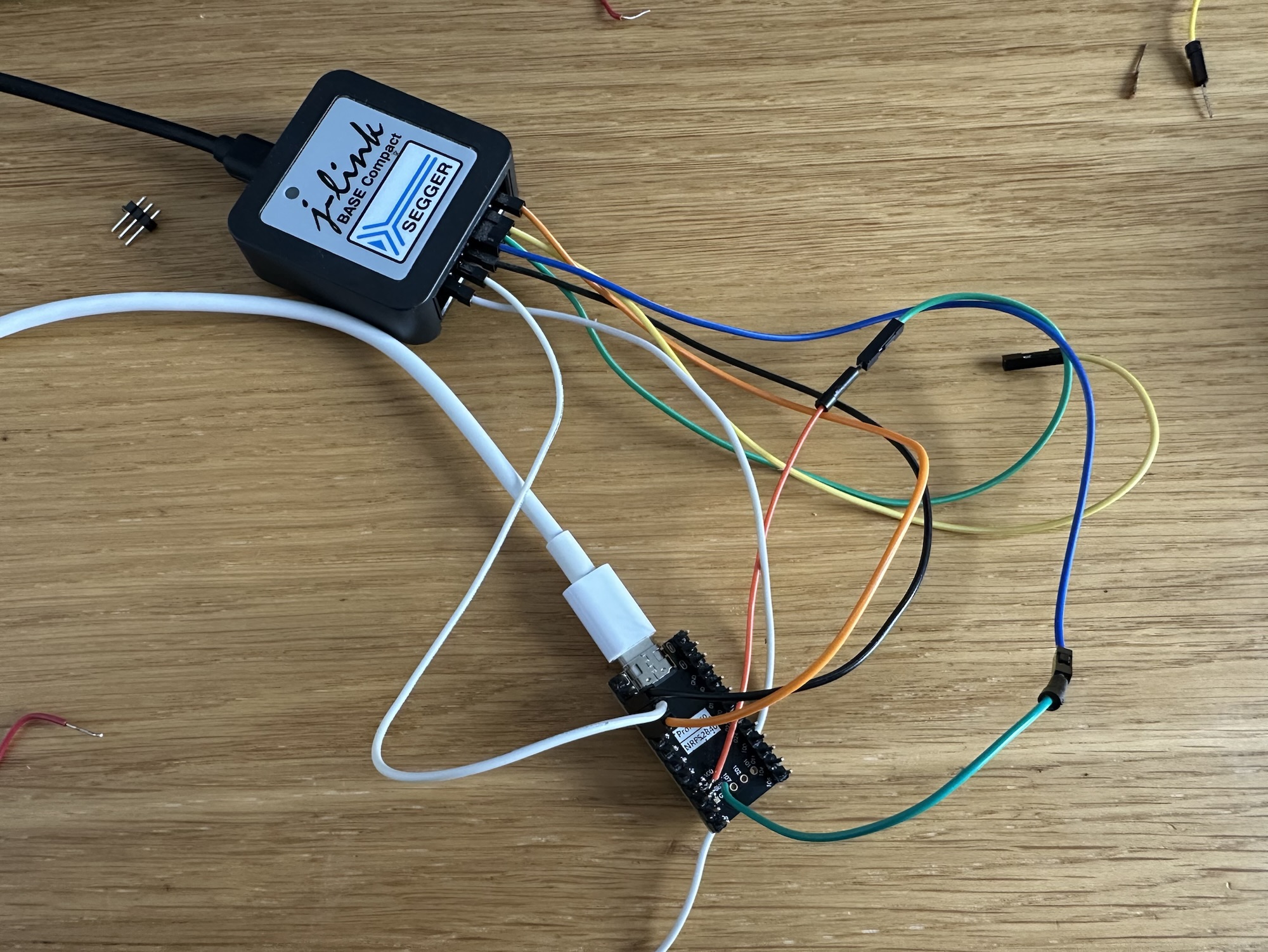 Thankfully, as I mentioned earlier, the board can be programmed via its SWD interface. I had my trusty J-Link programmer to hand and after some delicate soldering, I had the SWD interface connected.