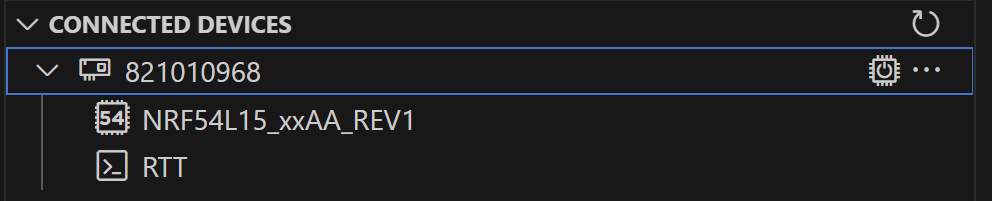I then refreshed the Device pane of the VS Code nRF Extension and the nRF54L15 was detected. I then tried RTT and that connected without issue!