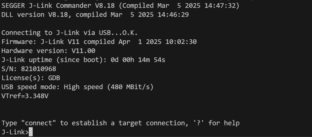 As I’m using the J-Link to power the board, I needed to use J-Link Commander to enable the power. I’m on Linux, so I start the commander using this command