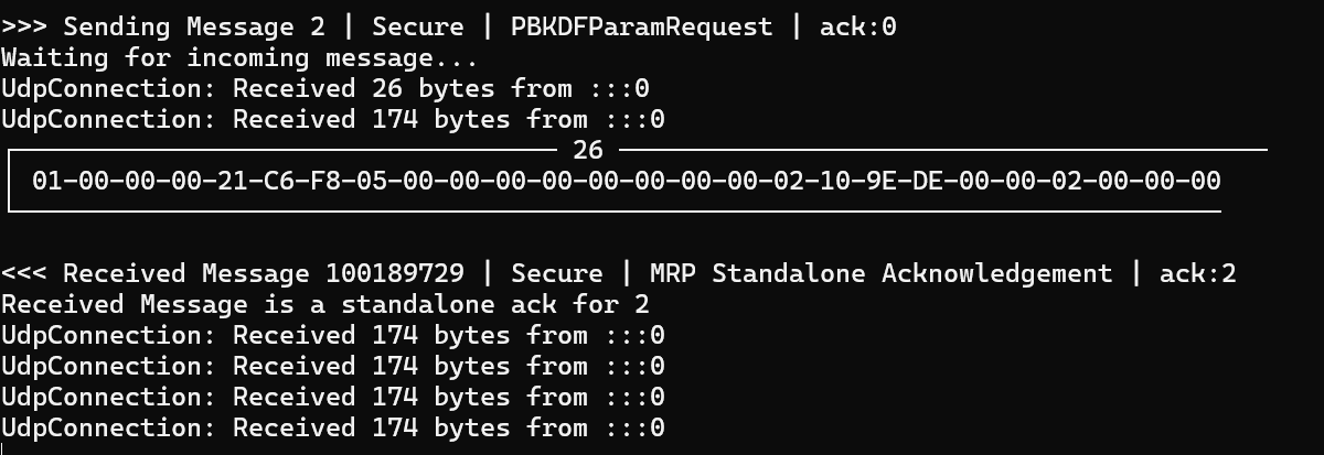 My message pump was behaving as intended. You can see the ack: 2 in response to my PBKDFParamRequest, but my message pump stops sending the incoming 174 byte payloads up to the caller. Unexpected, but my code is far from perfect. To keep going, I removed the flag.