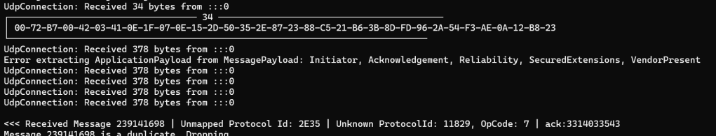 ExchangeManager Ignoring duplicate message 0 (requires no ack) for protocol 0 on channel udp://[2a02:8012:125a:0:adb0:1826:ee85:e66c]:51844