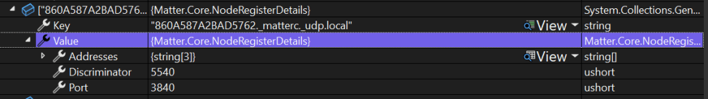 What struck me as odd here was that the Port was 3840 and the Discriminator was 5540. 3840 is the standard testing discriminator and 5540 is the typical Matter UDP Port number! Sure enough, I had two parameters mislabelled, but that didn’t help. The discriminator I was getting from the setup code didn’t match the mDNS TXT record value.