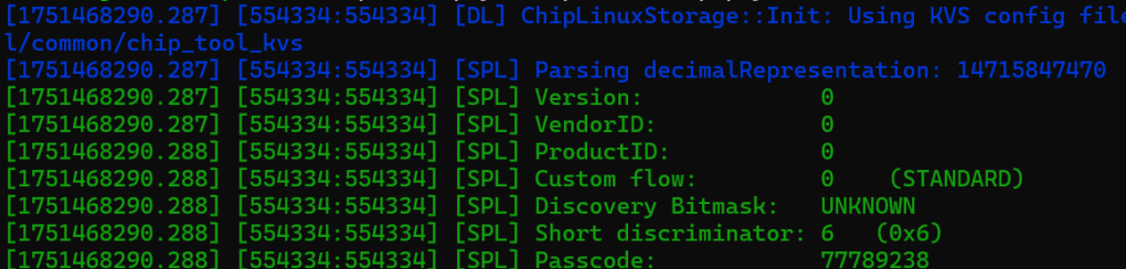 My discriminator parsed out as 1536, which is correct for a short discriminator value of 0x06. The passcode was also correct, matching with 77789238. The discriminator value in the TXT record is 1840.