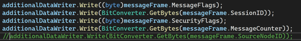 In my own code I was mixing up the sessionIds! This wouldn’t have mattered in the unsecure messages, since both sessionIds are 0, but now, in a Secure Session, I should have two. I refactored adding a PeerSessionId and I correctly generated a random sessionId