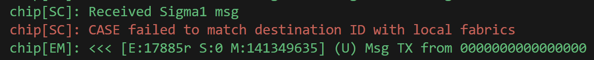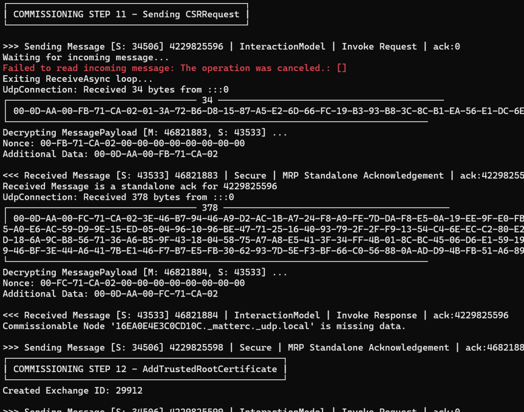 I returned to the matterjs matter-device emulator and tried it. Suffice to say, that didn’t work either. After some messing around with MessageExchanges, I got it working again (old exchanges were reading messages).