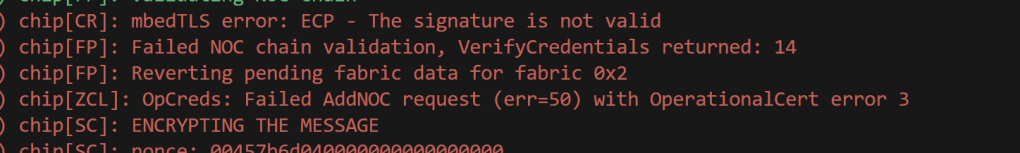 No matter what I tried, I couldn’t get the ESP32 to validate my certificate. The same code worked without issue against matterjs nodes, but not the ESP32.