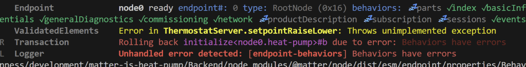 The matterjs API is pretty well thought out. There are a few little oddities I had to work through, but I got the basic Heat Pump device configured. That is probably one of the more complex devices in Matter, so I’m happy to get it done!