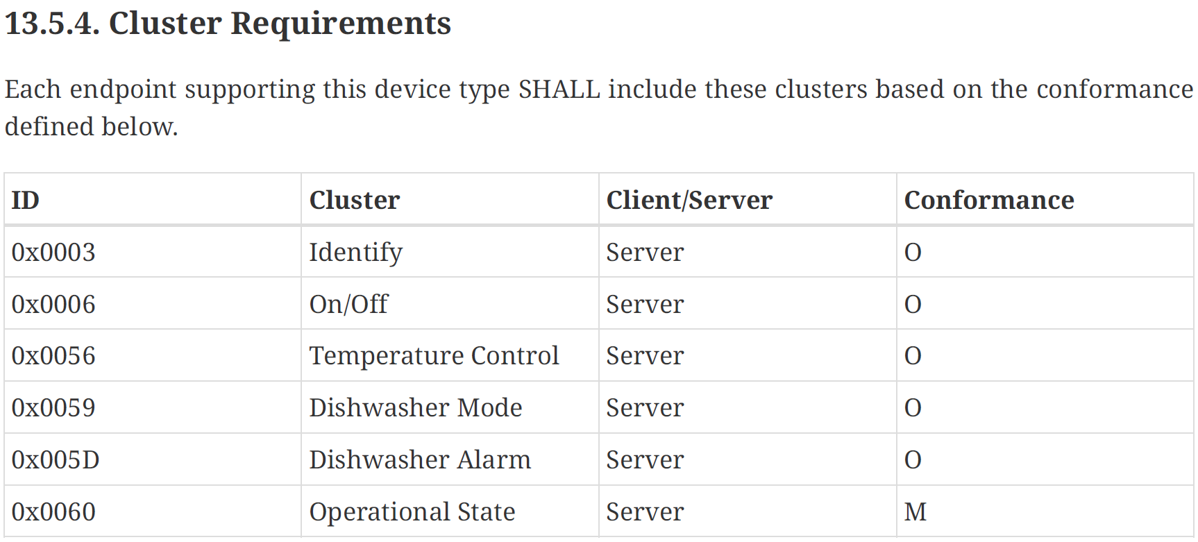 For the Dishwasher, it only had one endpoint, the Dishwasher endpoint and on that, only the OperationalState cluster was mandatory.