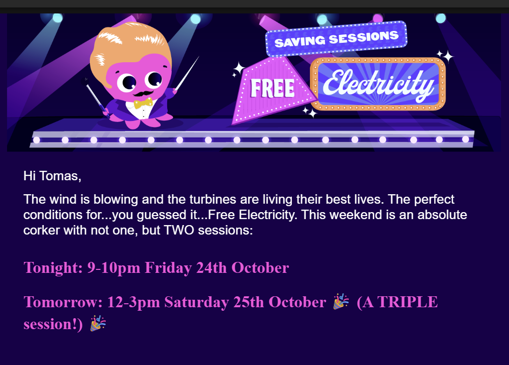 In the case of Octopus, these free events typically occur when there is too much wind energy available. Rather than turning the turbines off, they try to get people to use more power. The opposite occurs when there isn’t enough power. Octopus will have a Saver Session to encourage people to use less power.