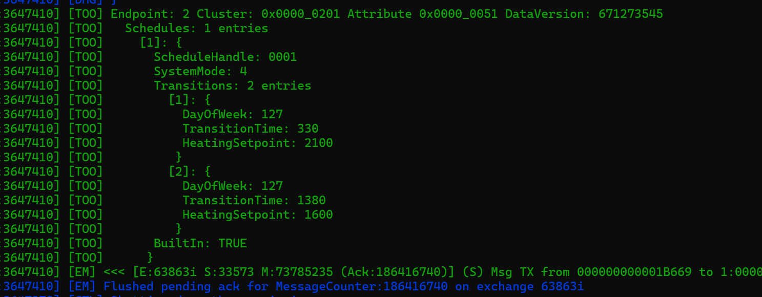 As I discovered recently, the Matter Schedules feature of the Thermostat isn’t implemented in the CHIP-SDK. I’m trying to add this by raising PRs, but it’s slow going 🙂