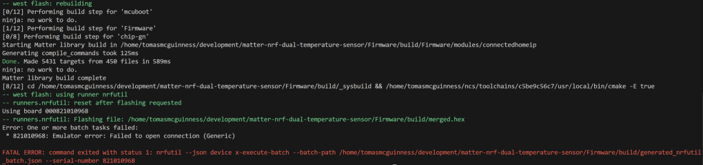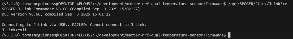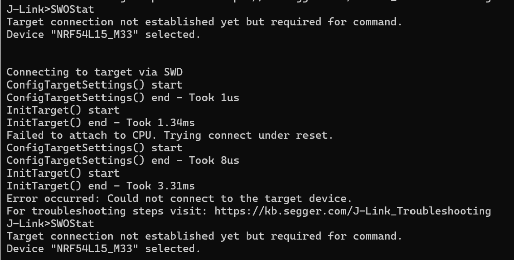 Like I did when evaluating the HolyIoT Board, I launched JLinkExe on my WSL instance. This threw up a horrible error. Despite sharing the J-Link device via USBIPD, it couldn’t connect.