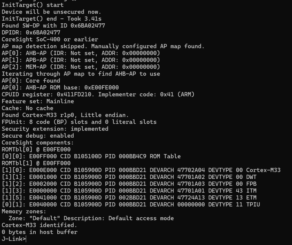 Lots of sensible looking messages came back. I considered this progress. It even indicated that a Cortex-M33 was identified, which looked good!