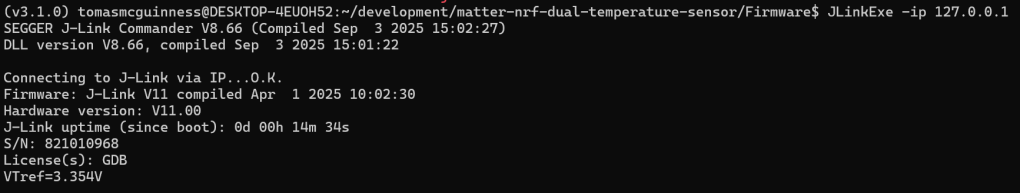 This looked like a USB/WSL issue, so I jumped back to Windows and tried J-Link Commander. It was able to connect to the J-Link module and I successfully turned on power. I ran the “connect” command and used SWD as the interface type.