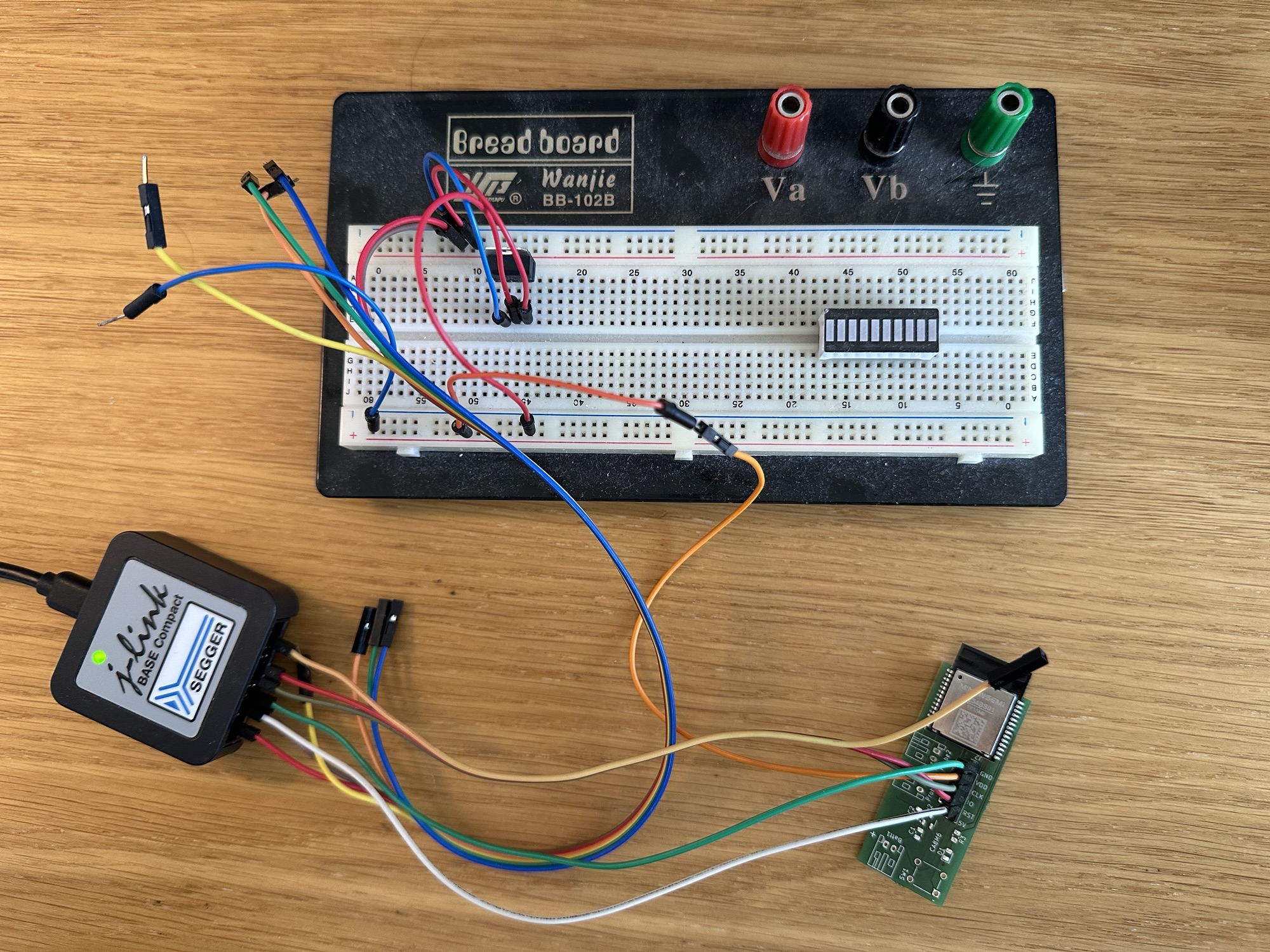 I connected it to my J-Link programmer, just like I did with the DevKit boards. Due to my dodgy PCB, I couldn’t use the J-Link’s 5V supply directly. Instead, I passed it through an LDO and fed that to the VDD “output” on my PCB. Bit of a mess, but should