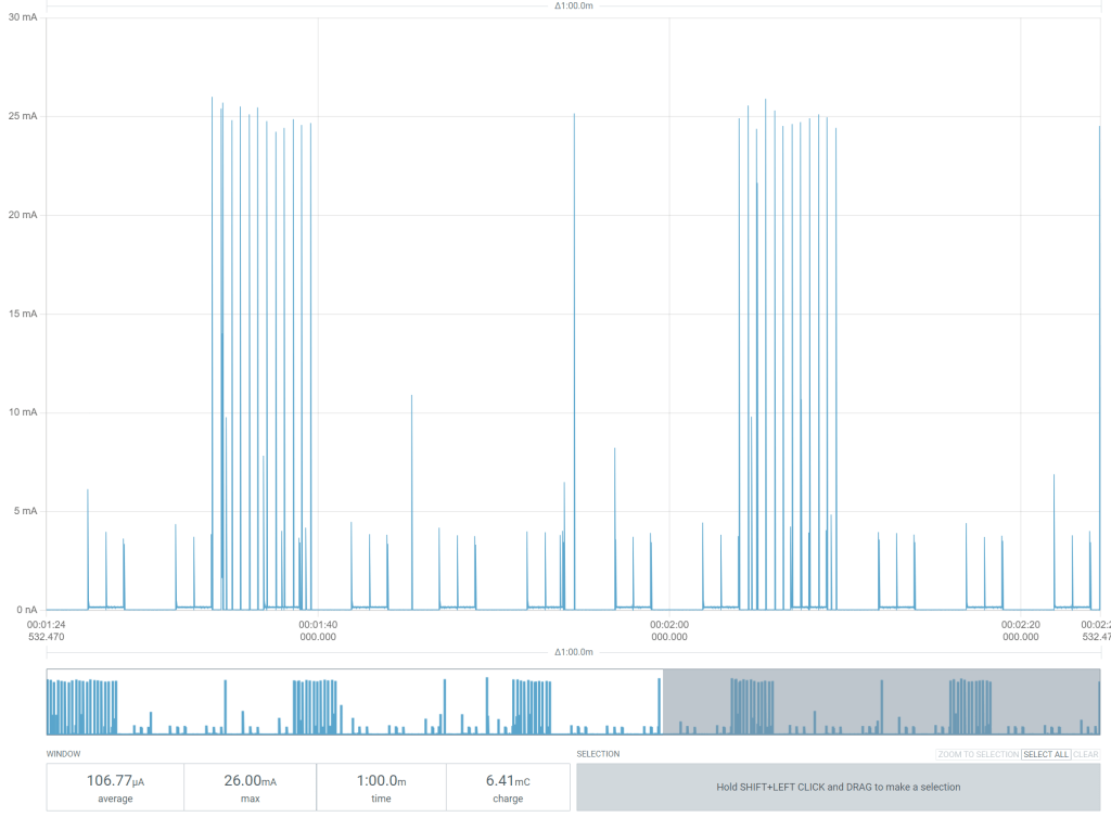 The chip should be pretty much asleep here, drawing only a few µA. I performed a build using the prj_release.conf, hoping that might help, but it didn’t.