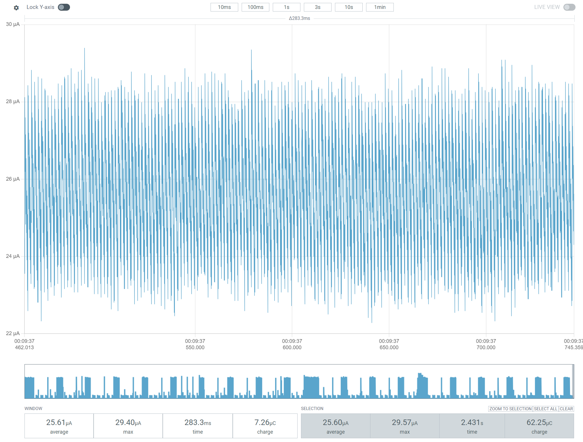 The chip should be pretty much asleep here, drawing only a few µA. I performed a build using the prj_release.conf, hoping that might help, but it didn’t.