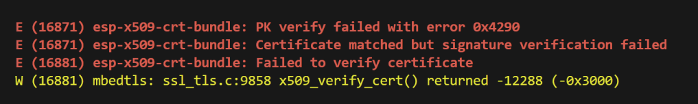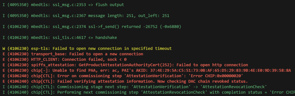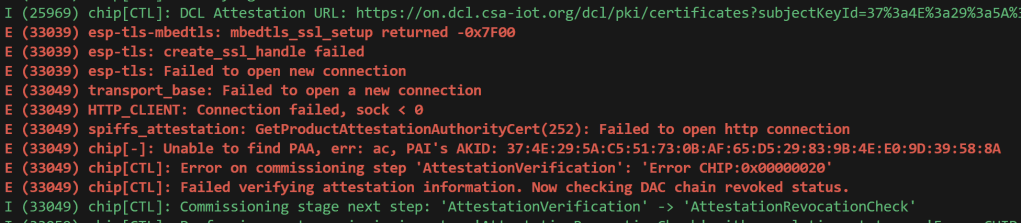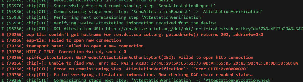 In the case of the chip-tool, I pointed it at a directory full of certificates. For the ESP32, I didn’t want to have to embed all the certificates. I turned on CONFIG_DCL_ATTESTATION_TRUST_STORE. The documentation said this would download the certs on demand, which seemed perfect.
