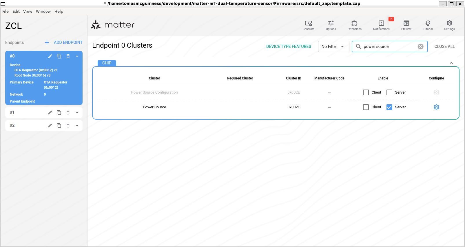 I then enabled the Power Source cluster on Endpoint #0, which is the root endpoint.