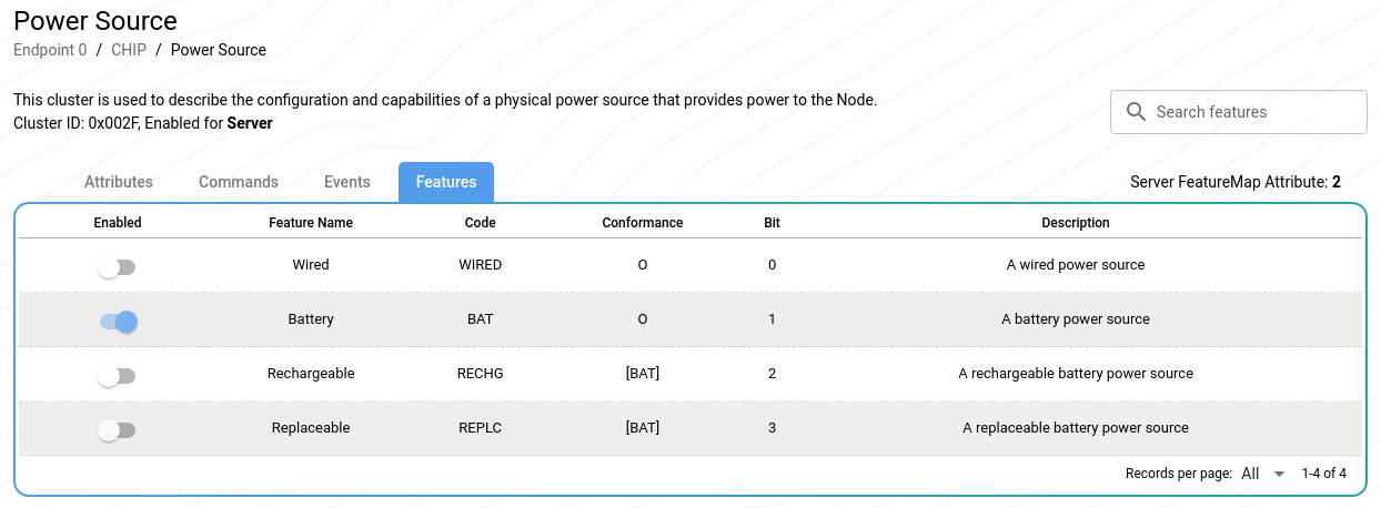 To start, we must first indicate if the device is battery powered, mains powered or both. This is done using the Features on the Cluster. For simplicity, I’m going to focus on the most basic implementation which is BAT or WIRED.