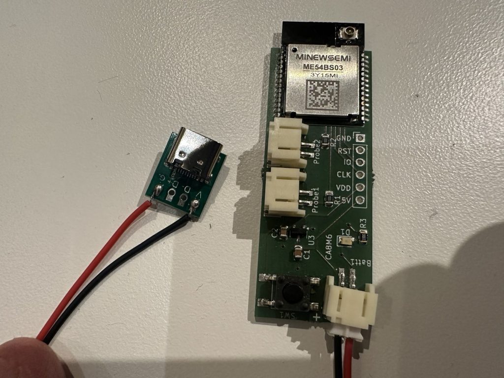 I immediately began thinking of a new PCB layout, but sanity prevailed and I went for a simpler option. A USB connector soldered to battery tails.