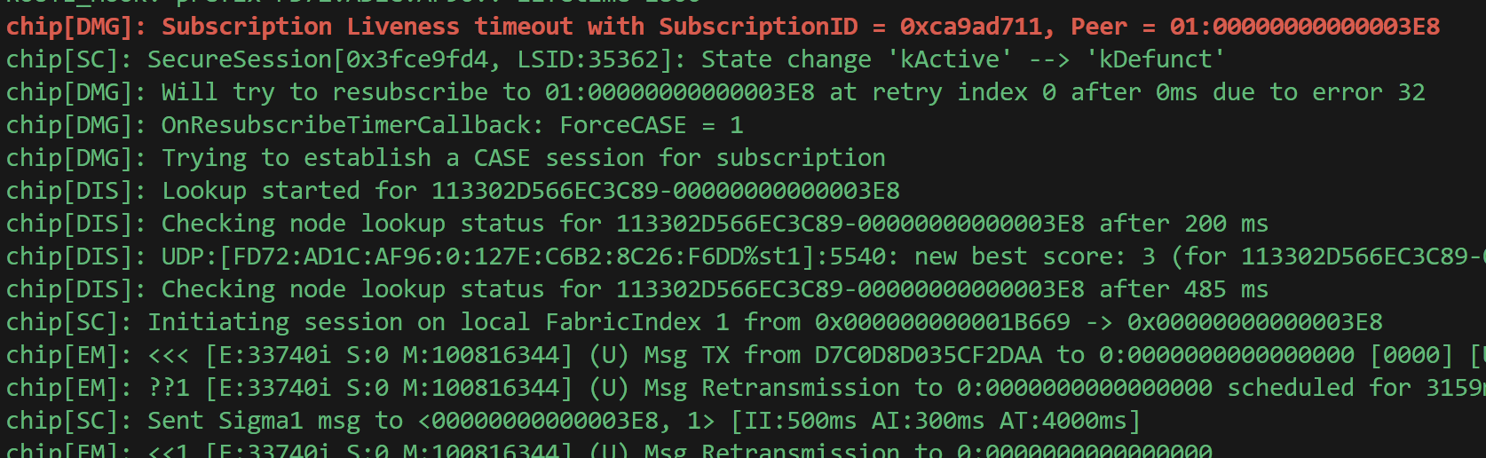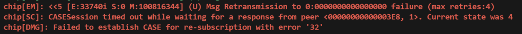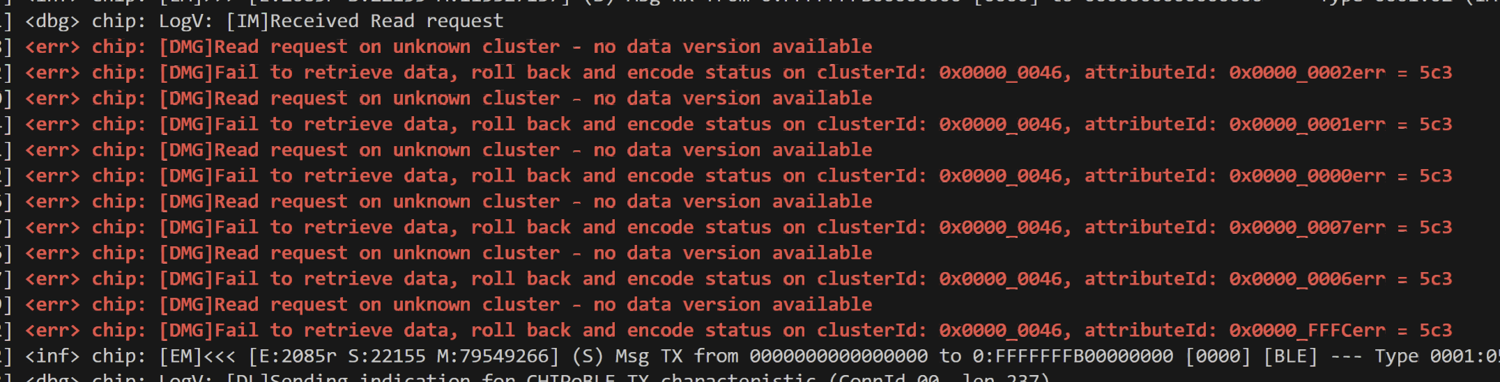[00:01:18.711,725] <err> chip: [DMG]Fail to retrieve data, roll back and encode status on clusterId: 0x0000_0046, attributeId: 0x0000_0006err = 586