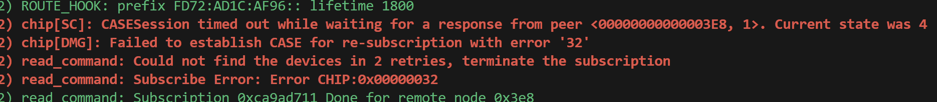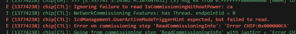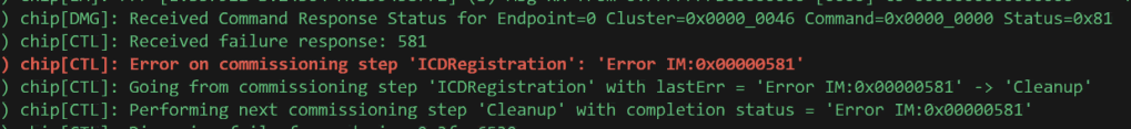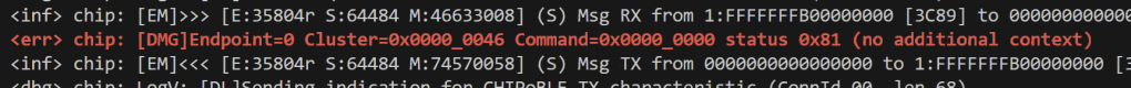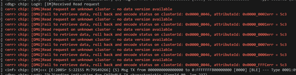 [00:01:18.710,790] <err> chip: [DMG]Fail to retrieve data, roll back and encode status on clusterId: 0x0000_0046, attributeId: 0x0000_0007err = 586