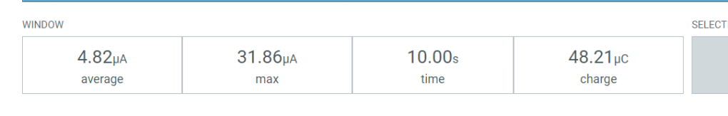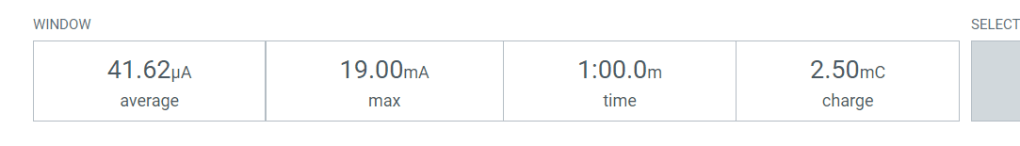 When I switch the power pin on, you can see a there is block of power consumption, which is 300µA! Nothing is actually happening here, I’m just allowing the voltage to settle. I began to wonder if 50ms was too long to wait.