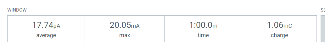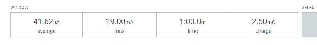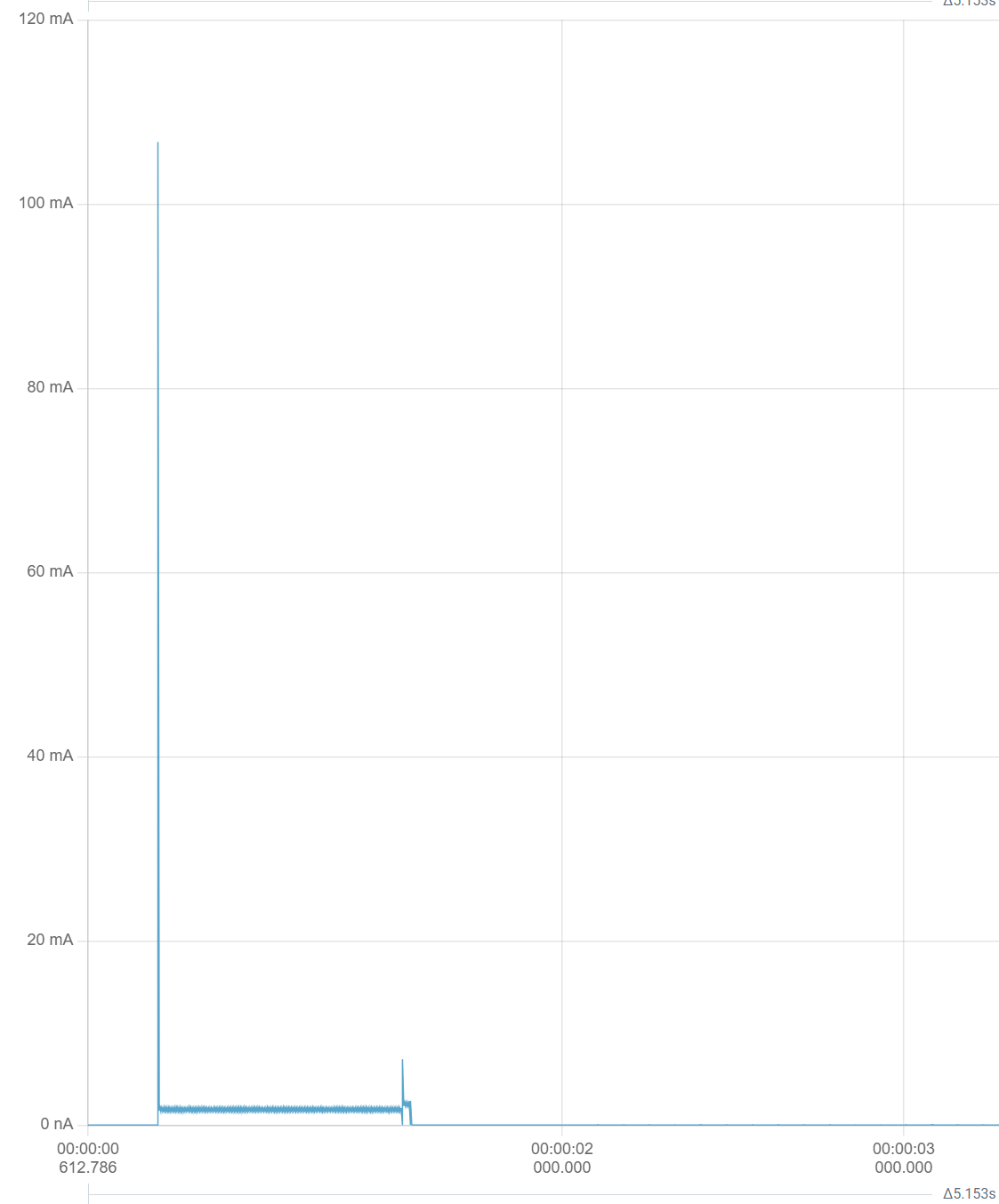 When I switch the power pin on, you can see a there is block of power consumption, which is 300µA! Nothing is actually happening here, I’m just allowing the voltage to settle. I began to wonder if 50ms was too long to wait.