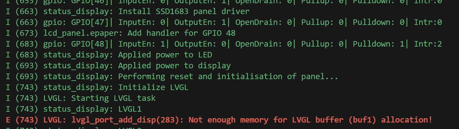 Unfortunately, out of the box, the e-paper driver, an SSD1683 wasn’t supported by Espressif. There was, however, a component for it – https://components.espressif.com/components/espressif/esp_lcd_ssd1681