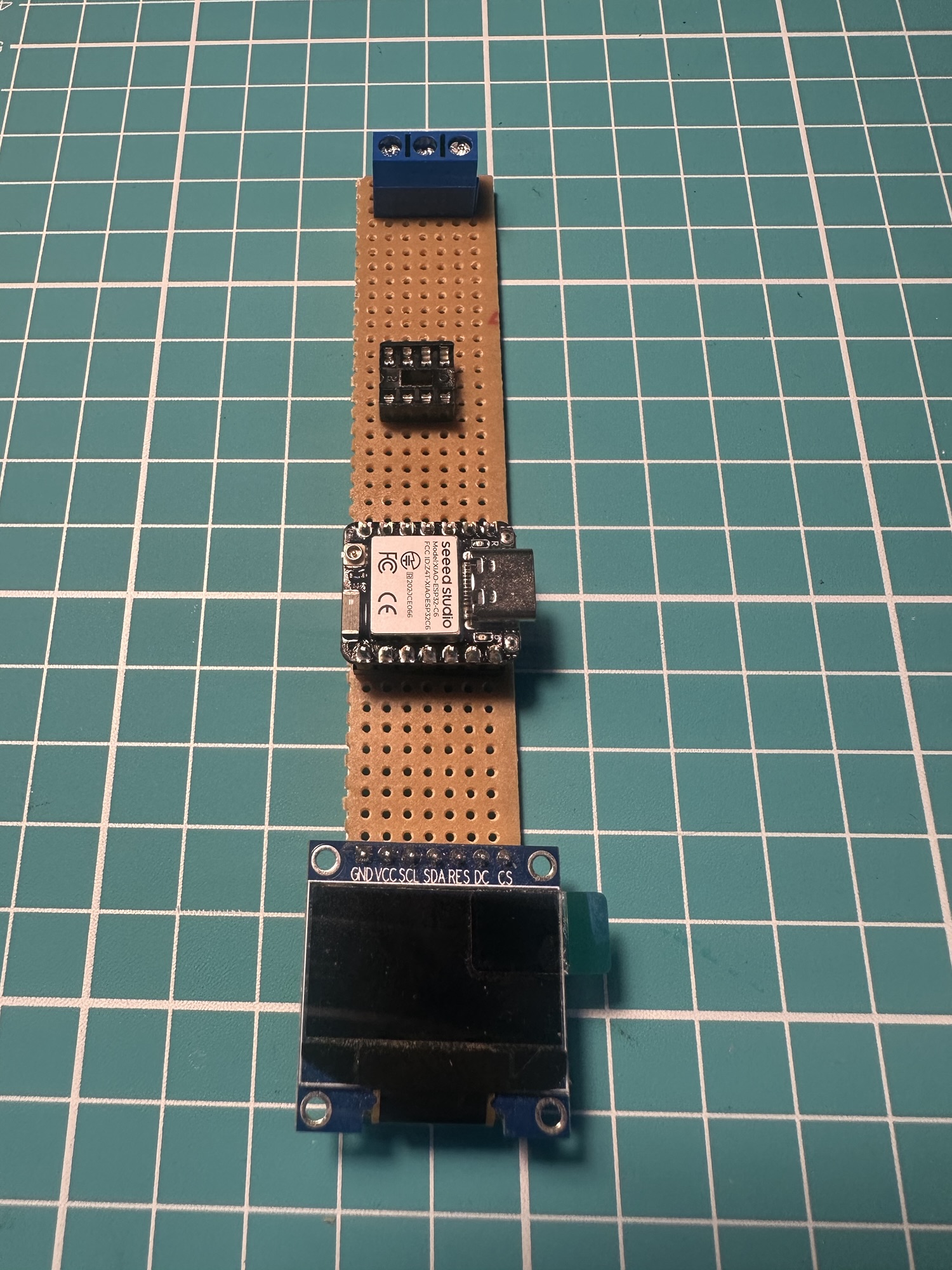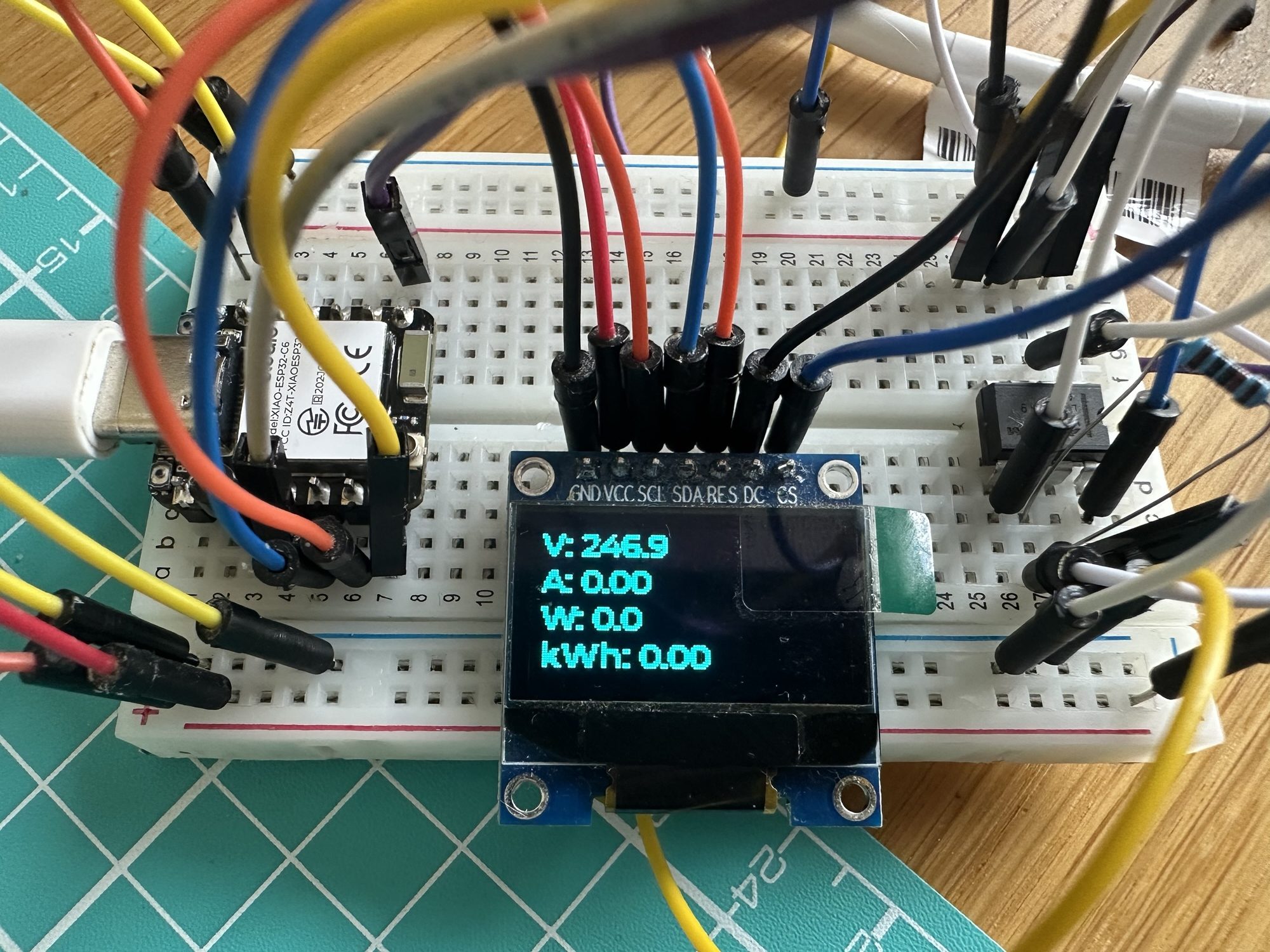 With my code reading four values from the device, I thought it might be helpful to display them. I had used a small OLED screen in my dishwasher emulator project, so I borrowed it.